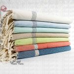 Nos serviettes, aussi appelées Fouta, en 100% coton, 100% tunisienne sont très douces et de très bonne qualité de tissage.