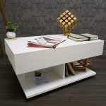 Cette table basse en blanc est très pratique avec un plateaux sous l’extension pour ranger magazines et journaux.